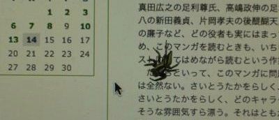だが今回のハエトリは、前のやつと違ってちょっと醒めていて、カーソルに飛びつくということがまったくない。多少は関心を示すが、結局そっぽを向いて画面の外に出て行ってしまった。今回は写真と映像を残そうと準備していたんだが、残念ながら映像はイマイチのもので、「無関心で画面の外に出て行く」図になってしまった。写真はとりあえずそれらしいものになったが、実際のところカーソル遊びはほとんどできていない。そのため、以前書いた文章にこの写真を添えると、ヤラセに近い感覚になる。